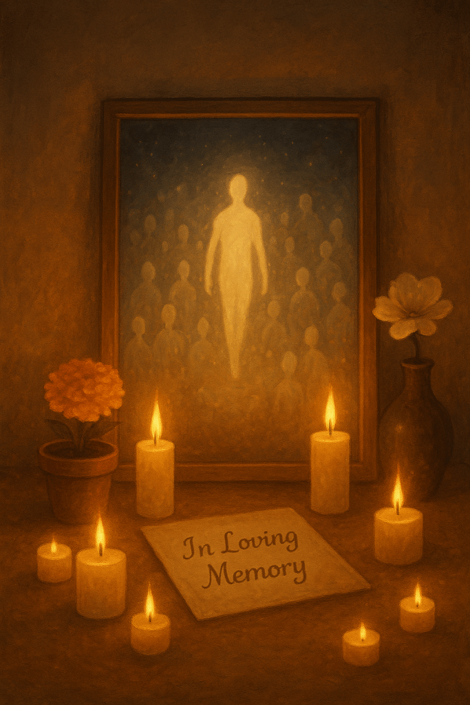 En cambio, si deseas pedir guía o protección a los difuntos en general, sin dirigirte a nadie en particular, coloca una imagen simbólica: puede ser una figura de luz, un dibujo de almas, una vela encendida o incluso una imagen creada por ti que represente a las almas que caminan en paz. Lo importante es que sientas que esa imagen canaliza respeto, calma y apertura.